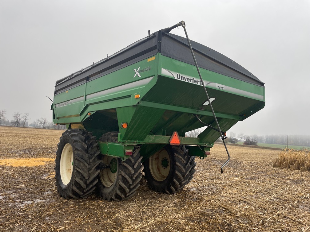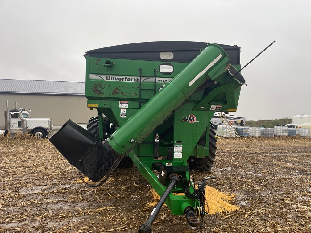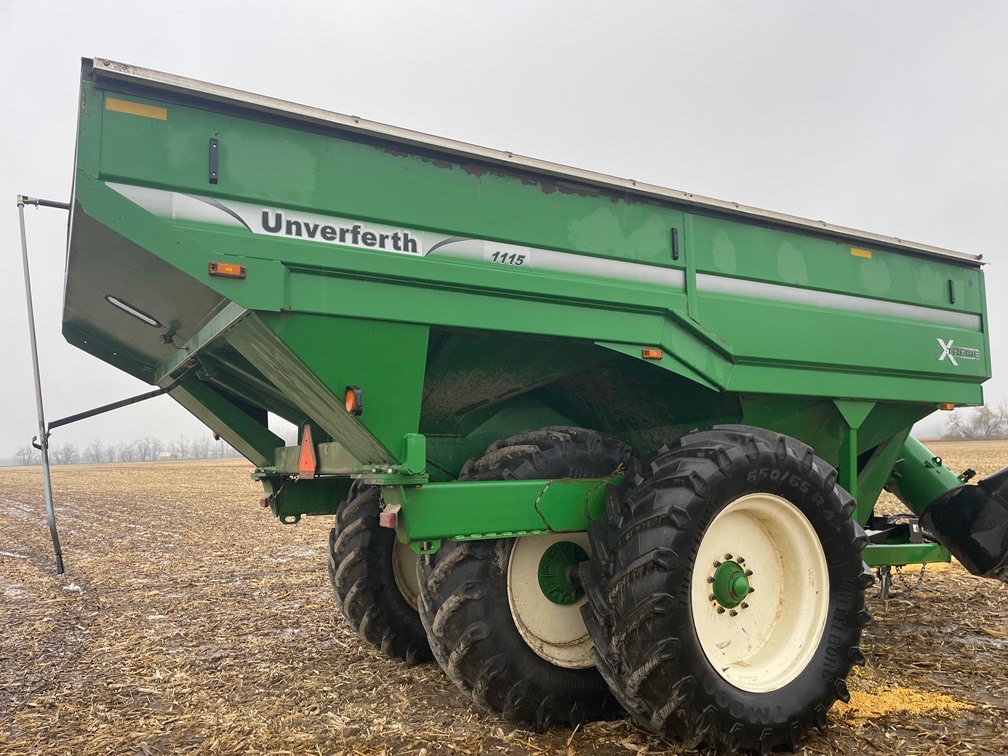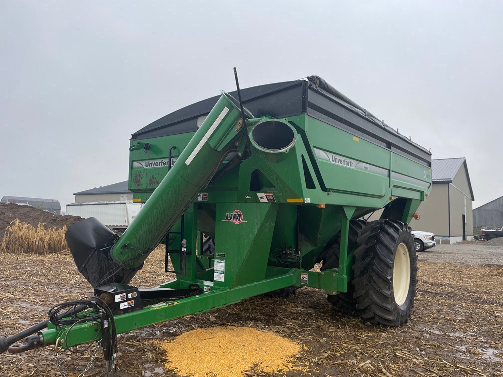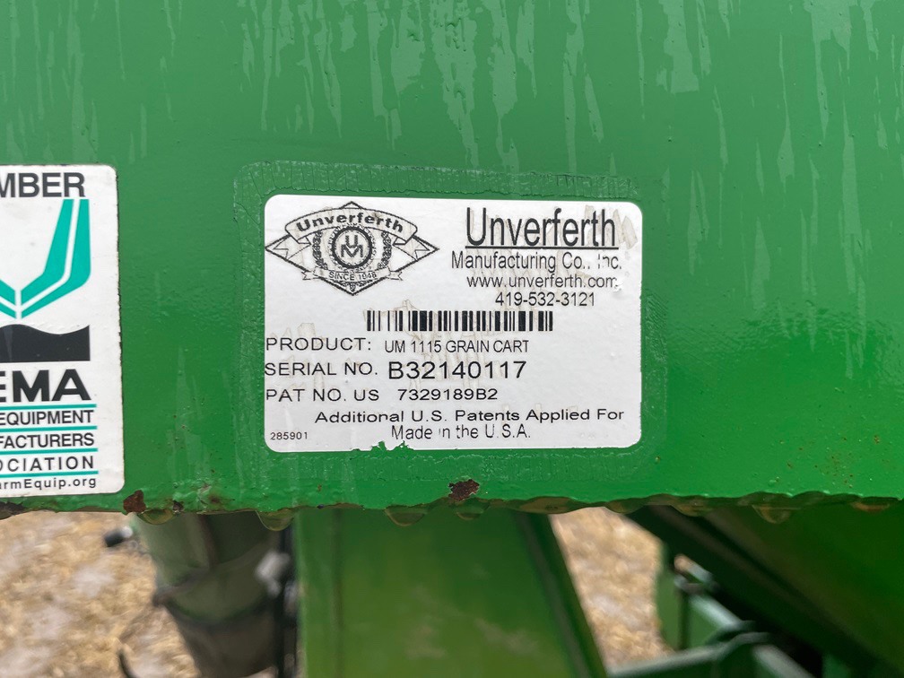 2013, UNVERFERTH, 1100BU CAP, SINGLE TANG HITCH, CORNER AUGER UNLOAD-FRONT FOLD, 20"AUG DIA, BOTH AUGERS HAVE BEEN UPDATED THIS SEASON, 650/65R42 BKT 80%, 1000RPM 1-3/4" PTO, ROLL TARP, WALKING TANDEM AXLE, TRANSPORT LIGHTS, WORK LIGHTS, GREEN