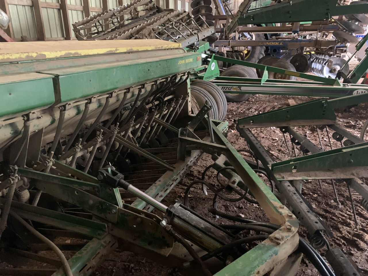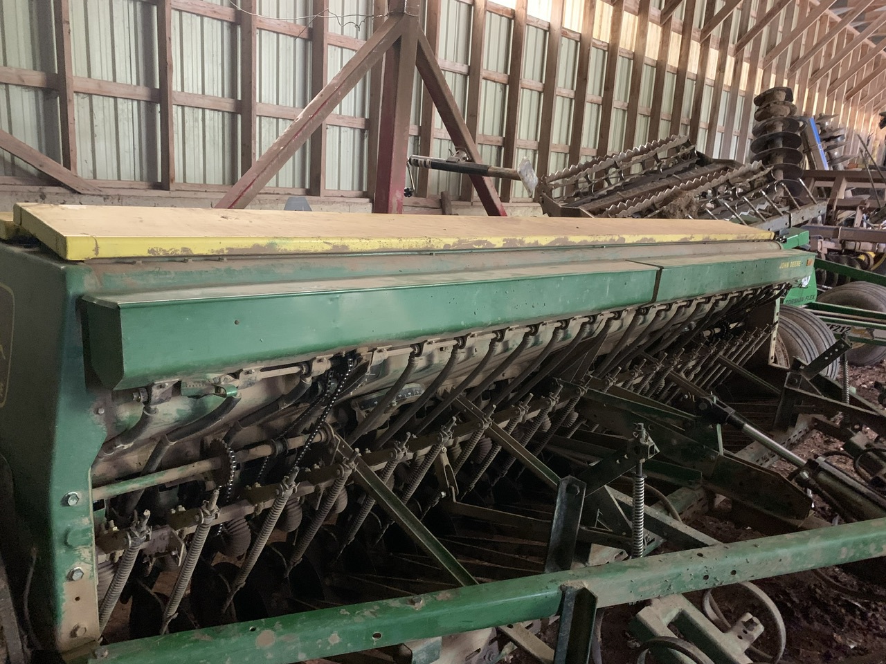 JD 8350, 12', DRY FERT, GRASS SEED, REAR HITCH, 21x7" SPACING, SINGLE DISC, 13" BLADE DIA, END WHEEL, CONVENTIONAL DRILL, CLEVIS HITCH, DOUBLE RIB DRILL TIRES, ONE OWNER