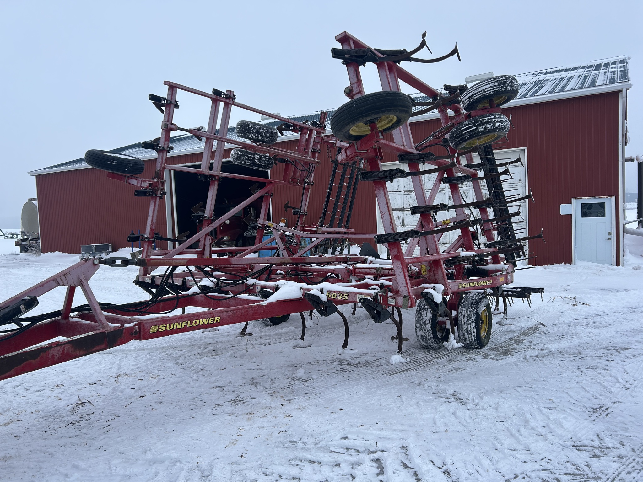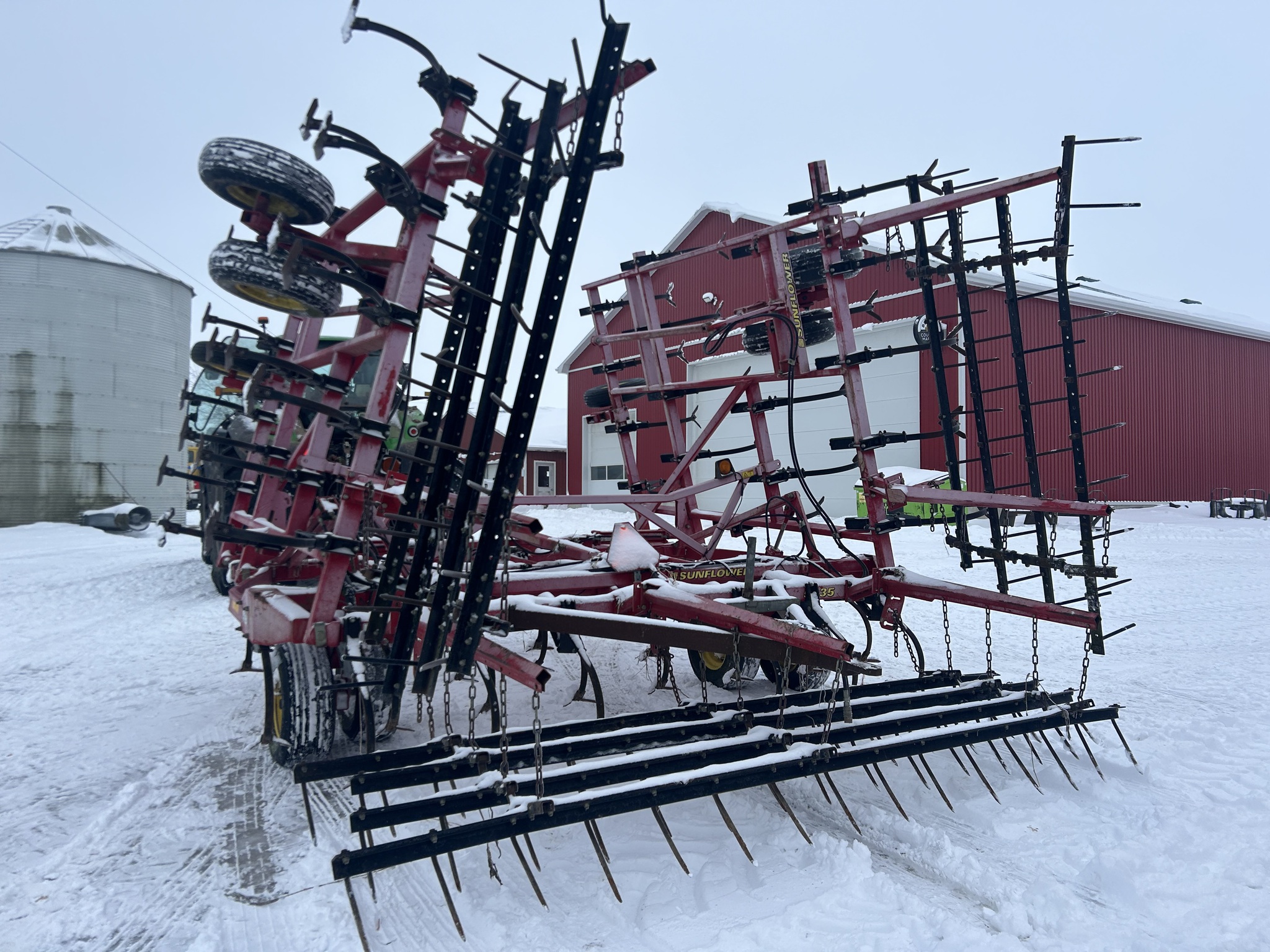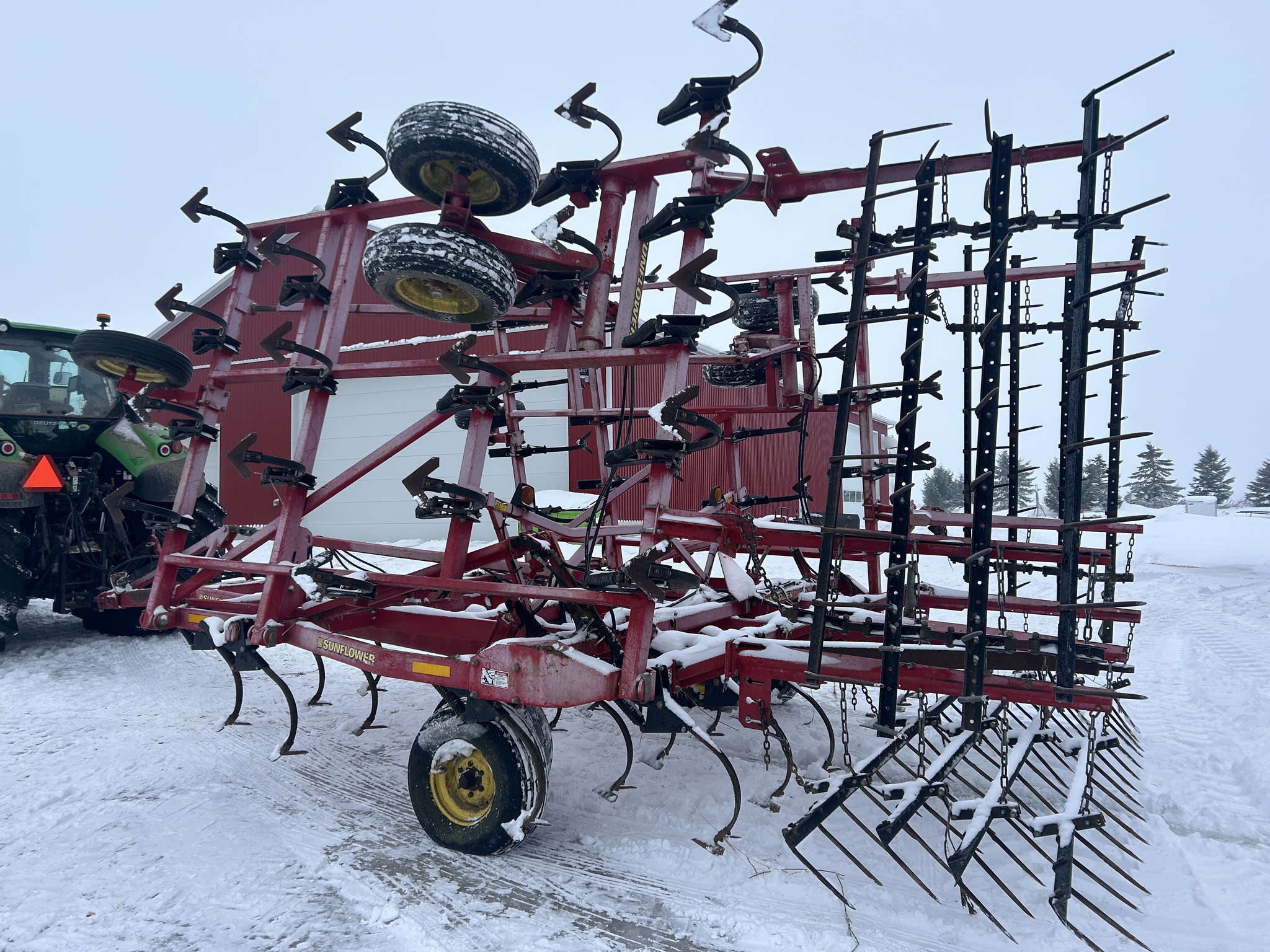 2009, SUNFLOWER, 32', C-SHANK, 8" SWEEPS, BOLT-ON SWEEPS 80%, 3 SECTION-WING FOLD, SELF LEVELING HITCH, WALKING TANDEM ON MAIN&WING, 4 BAR COIL TINE HARROW, SGL PT DEPTH CONTROL, REAR HITCH W/HYD