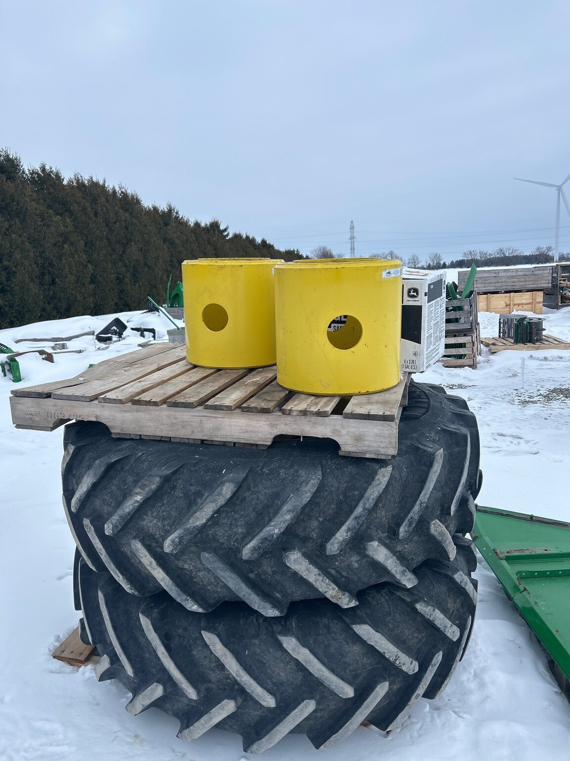 SET 420/85R34 FRONT DUALS, MICH, 70%, YELLOW RIMS, DISH, EXTENSIONS, HARDWARE