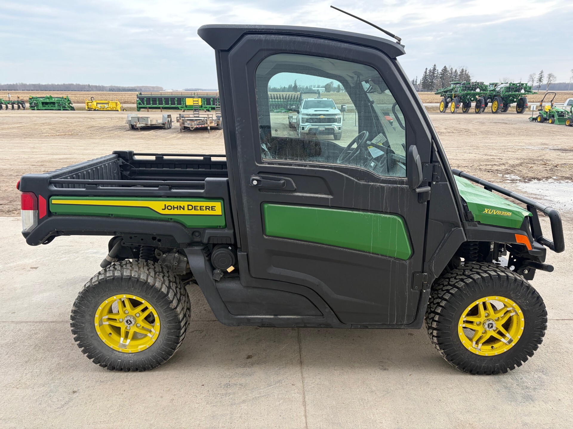 2025, 4x4, 52HP, 812cc, 80HR, CHERI, LIQ COOL, GAS, 3CYL, 2SPD CVT, FULLY ENCL DLX CAB, HEAT, A/C, 3 PASSENGER, BENCH SEAT, FRONT BRUSH GUARD, WIPER, ROPS, WINDSHIELD, MIRRORS, RADIAL TIRES, ALLOY RIMS, HD ALL PURPOSE TIRES 90%, GREEN & YELLOW, POLY ROOF, POWER STEERING, POWER BOX LIFT, MACHINE HAS FULL COMPREHENSIVE-, WARRANTY UNTIL 11MAR28 OR 600 HOURS