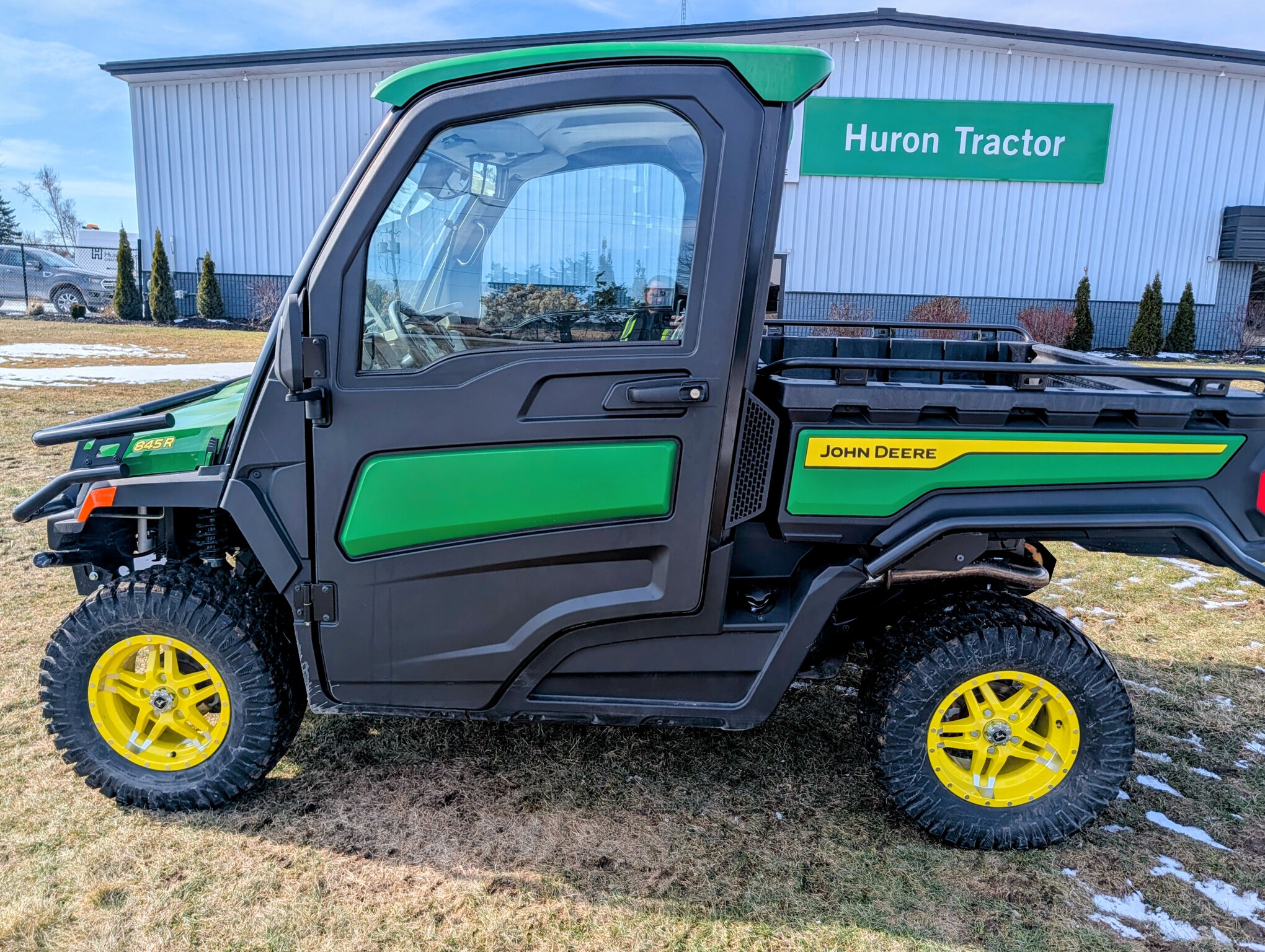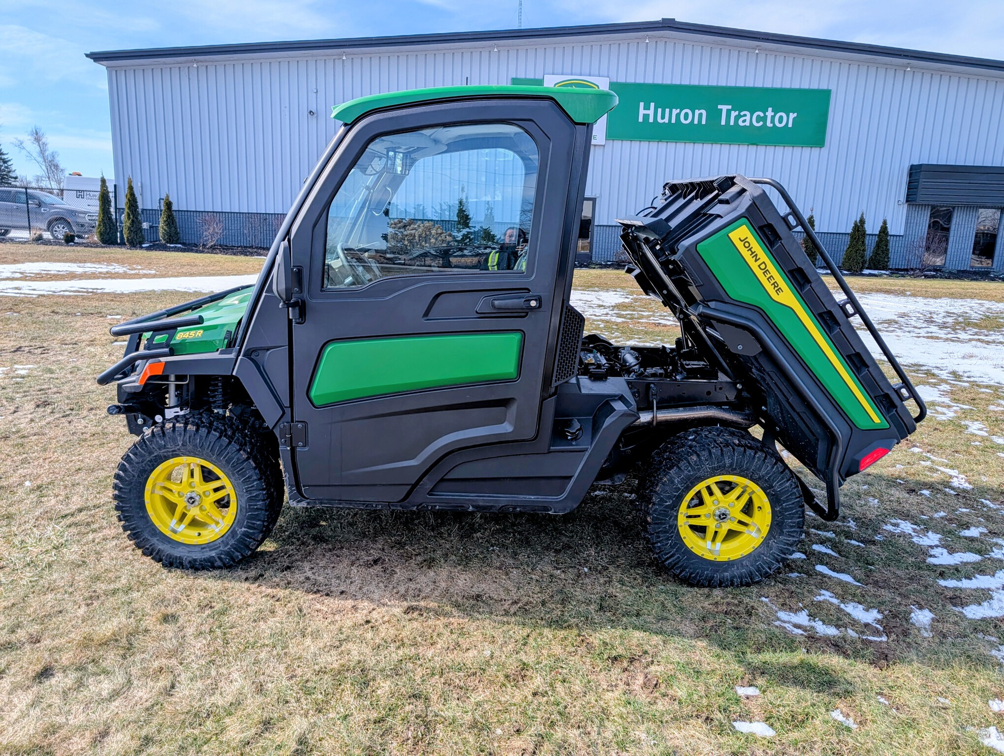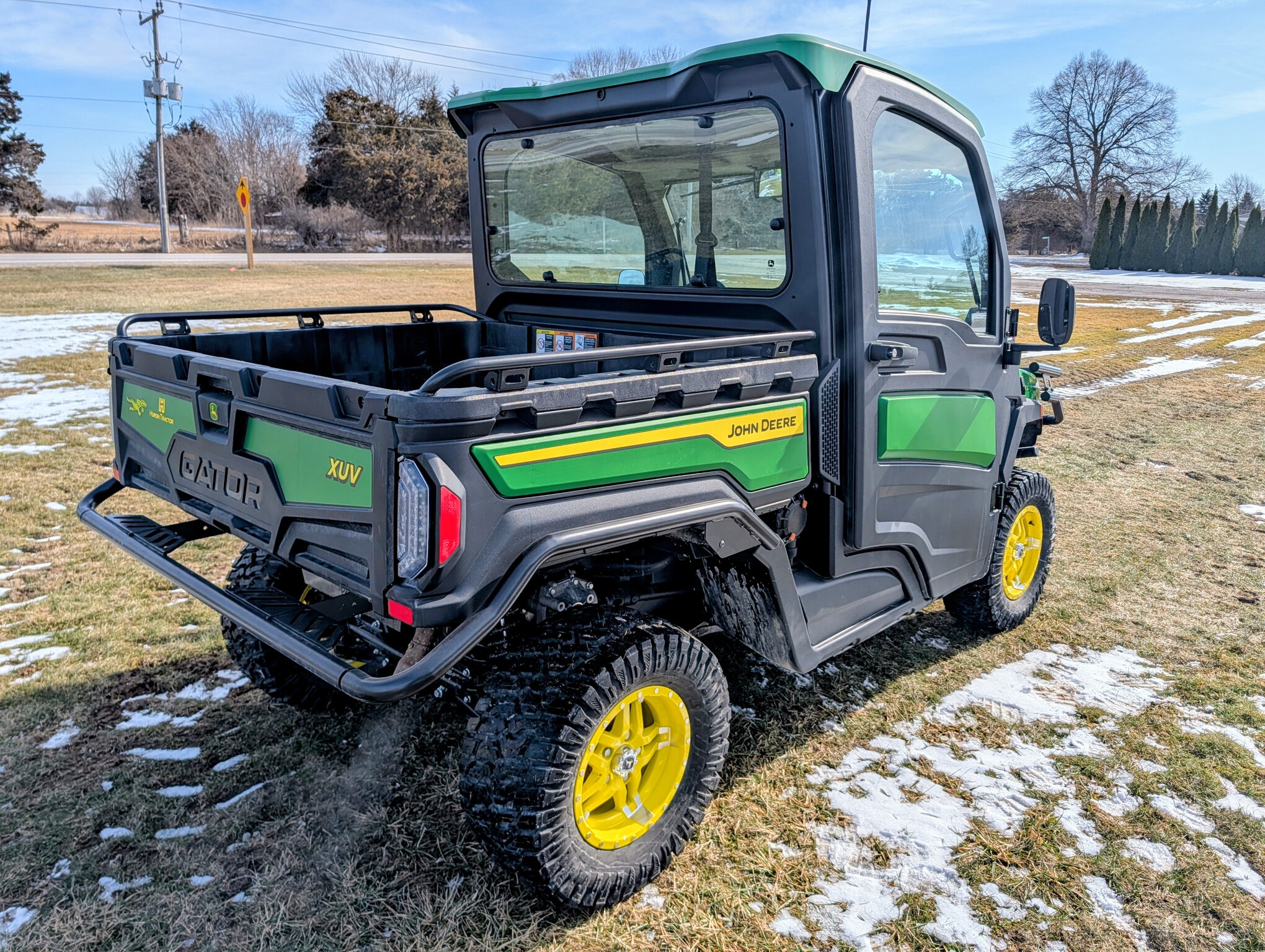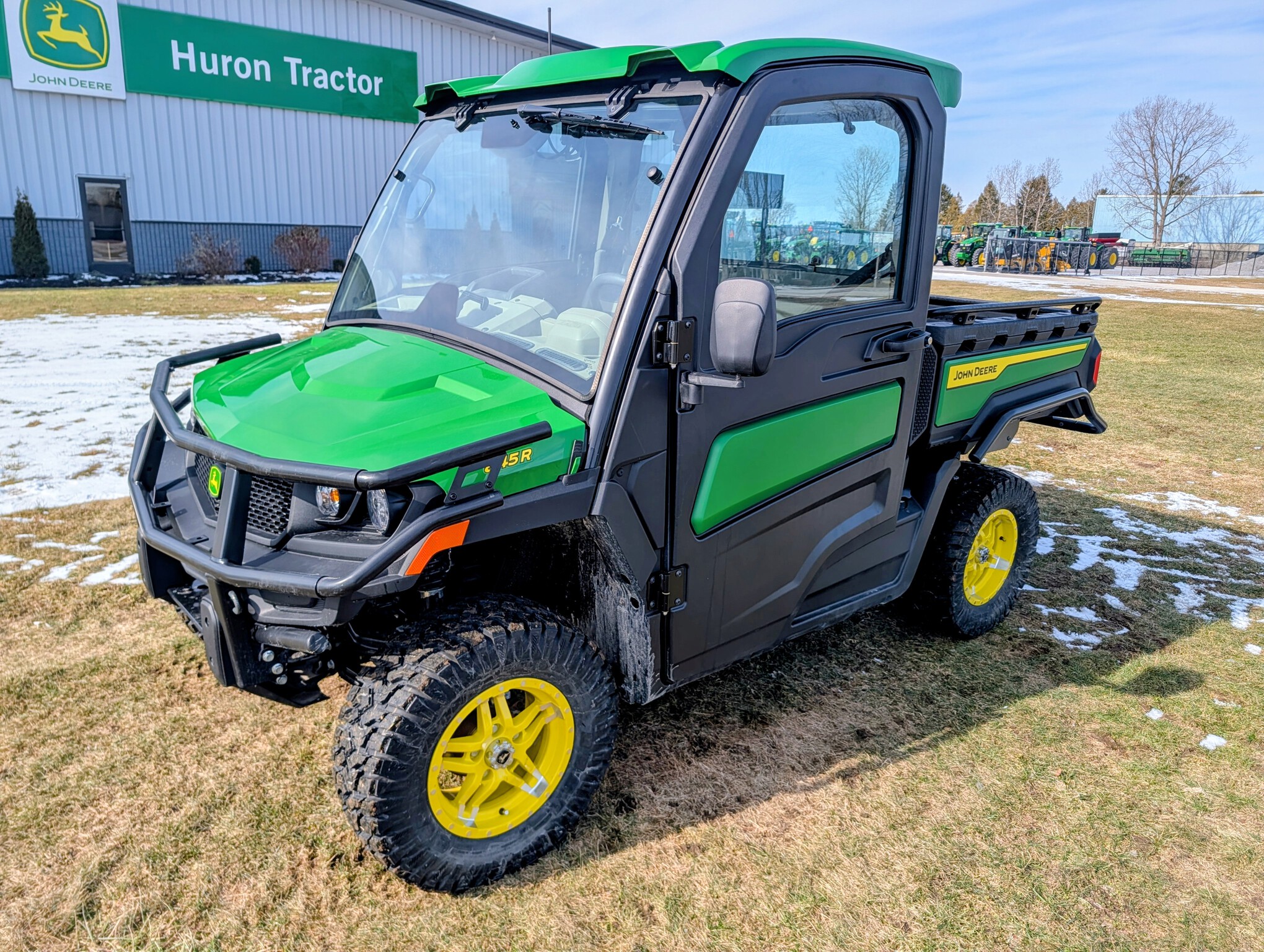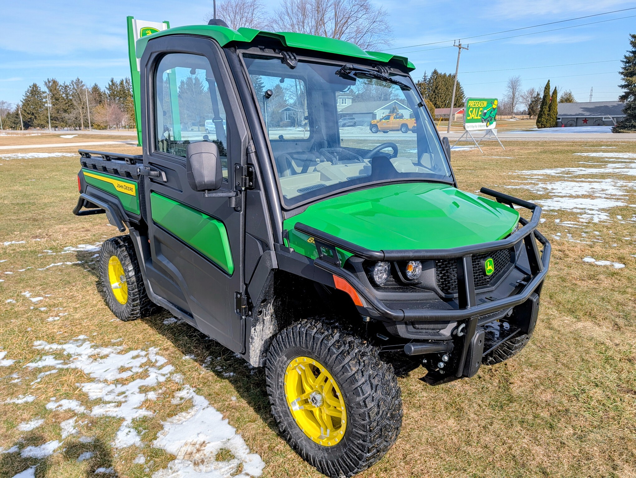 2024, 4x4, 52HP, LIQ.COOL, 2SPD CVT, GAS, DLX CAB, A/C, PWR STEER, PWR BOX LIFT, POLY ROOF, BEDLINER, PWR WINCH, RADIAL TIRES, HD ALL PURPOSE 95%, ALLOY RIMS, WINDSHIELD, MIRRORS, FRONT BUMPER, FRONT BRUSH GUARD, TURN SIGNALS, 2 PASSENGER, BENCH SEAT, GREEN & YELLOW, INSPECT&FULL SERVICE, FACTORY WARRANTY UNTIL 09JUN26
