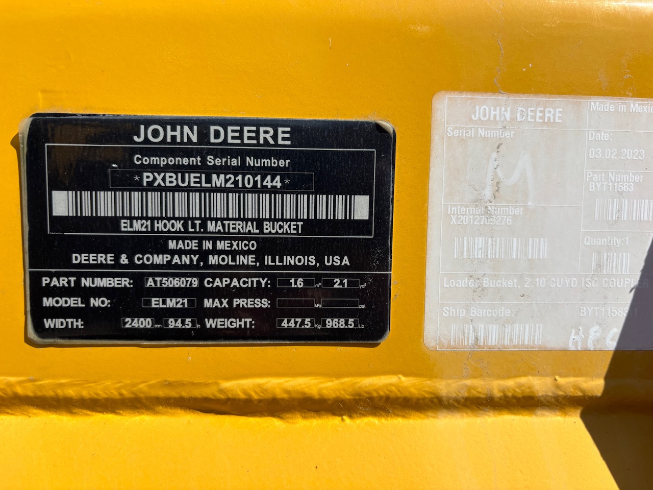 JD 2.1 CU.YD BUCKET FOR JD 324P WHEEL LOADER